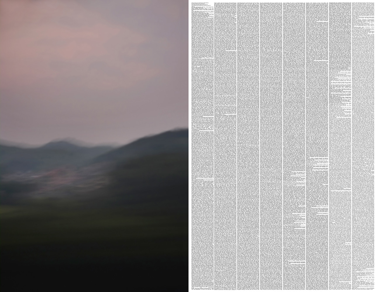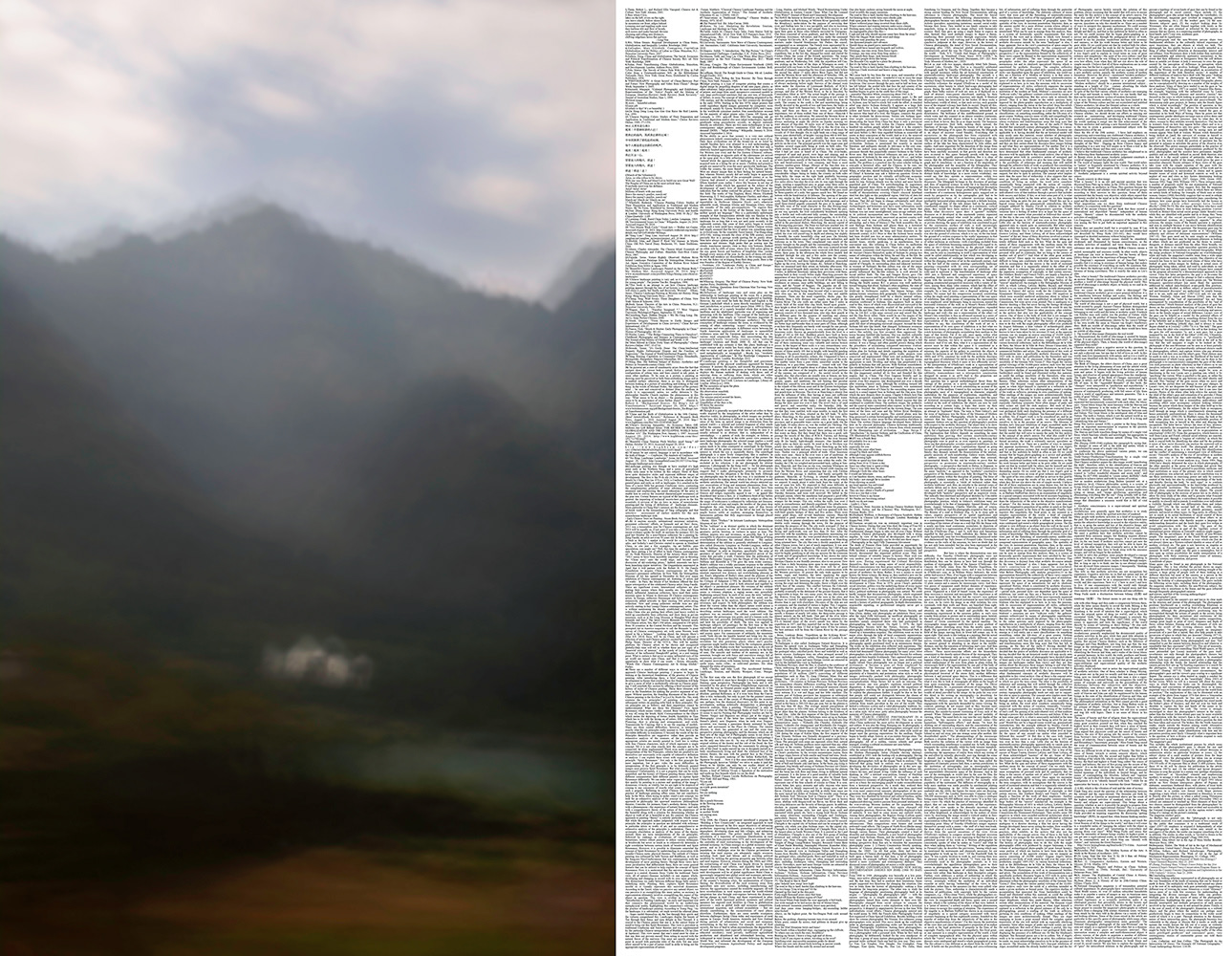 In addendum to the project on the American West, these works take the Chinese landscape as their subject and they try to enfold some of the traditions of Chinese painting and Chinese art practice to further explore photographic representation of the landscape. The same techniques of motion and slow shutter speeds were applied in capturing the images, but they were photographed using the (Western) portrait orientation in reference to certain styles of Chinese painting. Each of the works displays a photograph, flanked by an equal sized body of text. This text is in part influenced by the Chinese practice of attaching a colophon to a painting, and the western method of bibliographic referencing. The text contains a multitude of references connected to the adjacent landscape in an attempt to broaden the way that the image can communicate. These references may be strong, weak or even spurious and highlight how the landscape often becomes a blank canvas upon which we the viewer may project the most tenuous or contrived meanings. The sheer number of references begs the use of a tiny font, which, when viewing the work as a whole presents a blurring of both image and text, further hampering the works ability to communicate with a specific voice.