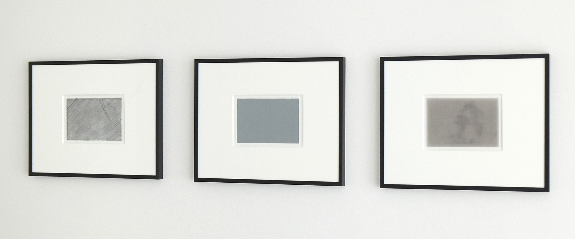 Ross Kelly, Four Children Laying on a Lawn Dressed in White, with Dog in Foreground (Installation View), 2016, Triptych Composed of a Graphite Rubbing, Block Print and Wax Cast of the Surface of a Photograph, 5" x 7"