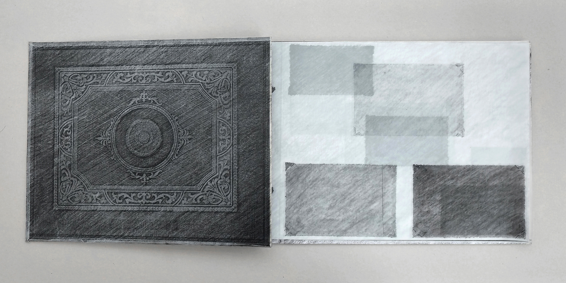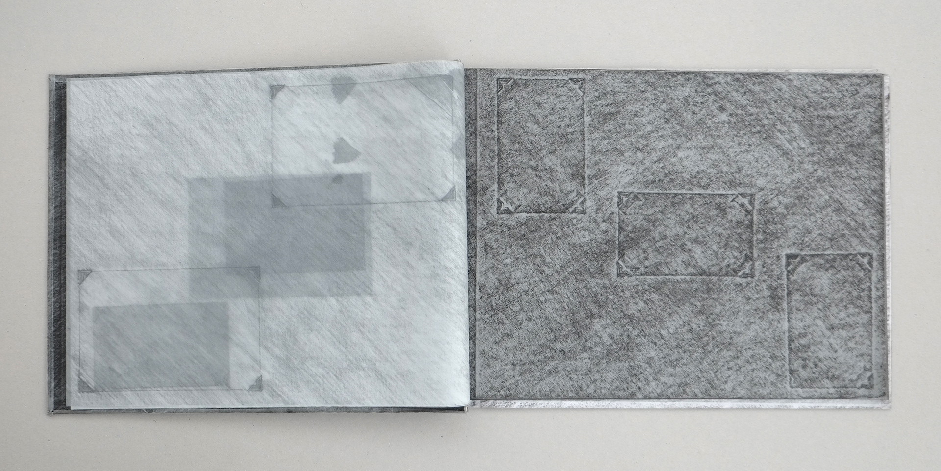 Ross Kelly, Illuminated Manuscript #2 (Inside Cover & Page 1), 2016, Graphite Rubbing of Each Page from a Found Photograph Album, Rebound and Assembled to Replicate the Original - 13" x 17" (35 pages)