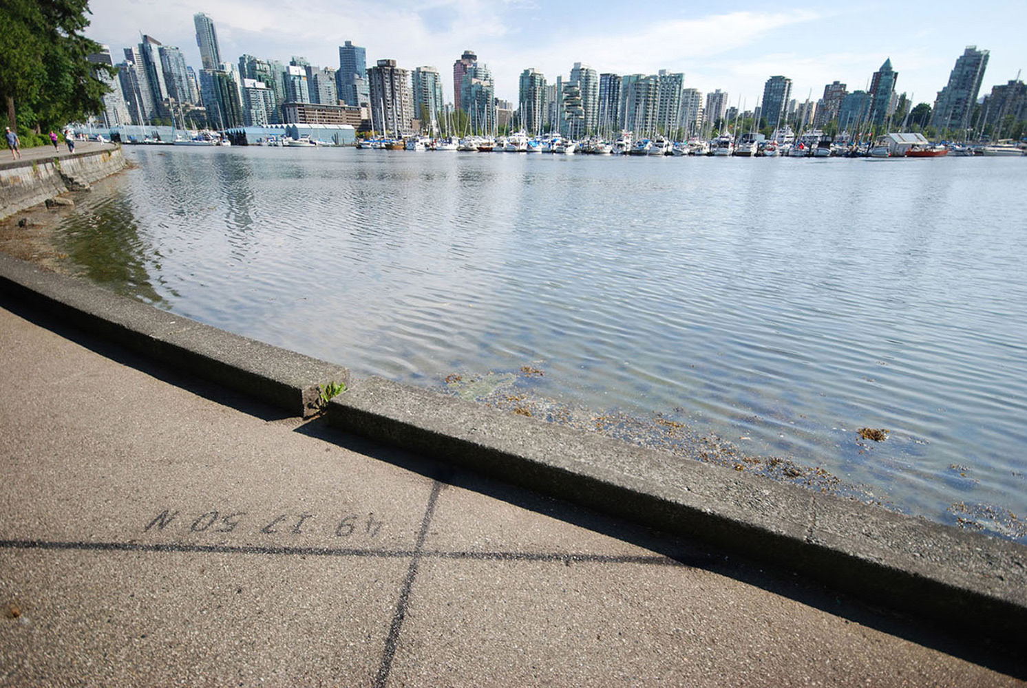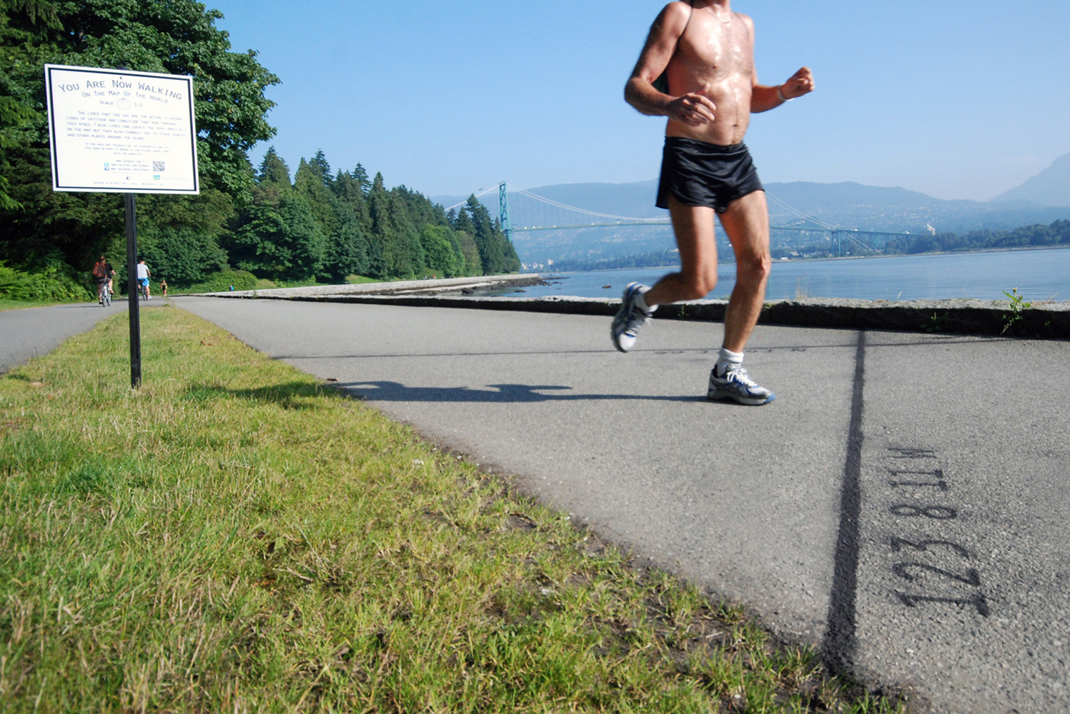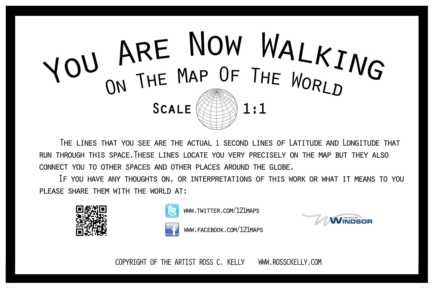This is a site-specific conceptual art work that involves marking lines of latitude and longitude and their numerical coordinates on the ground, thus converting our everyday surroundings into a readable 1:1 scale map. The work reflects on the idea of location, and how our position is always relative to other places. Normally, these lines that we are used to seeing on maps - measured in degrees, minutes and seconds are many hundreds of miles apart but the smallest whole increment, 1 second, is only 20 to 30 meters in span . By inscribing the actual 1 second interval lines on the ground, we extract them from the abstract world of the 2D map and place them in an more intuitive and intelligible human context. This project tries to provoke viewers to look at their everyday surroundings in a fundamentally different way. The 1:1 map was staged on Windsor Ontario’s Riverfront Trail and on the Vancouver Seawall, with the assistance of the City of Windsor and the Vancouver Park Board.