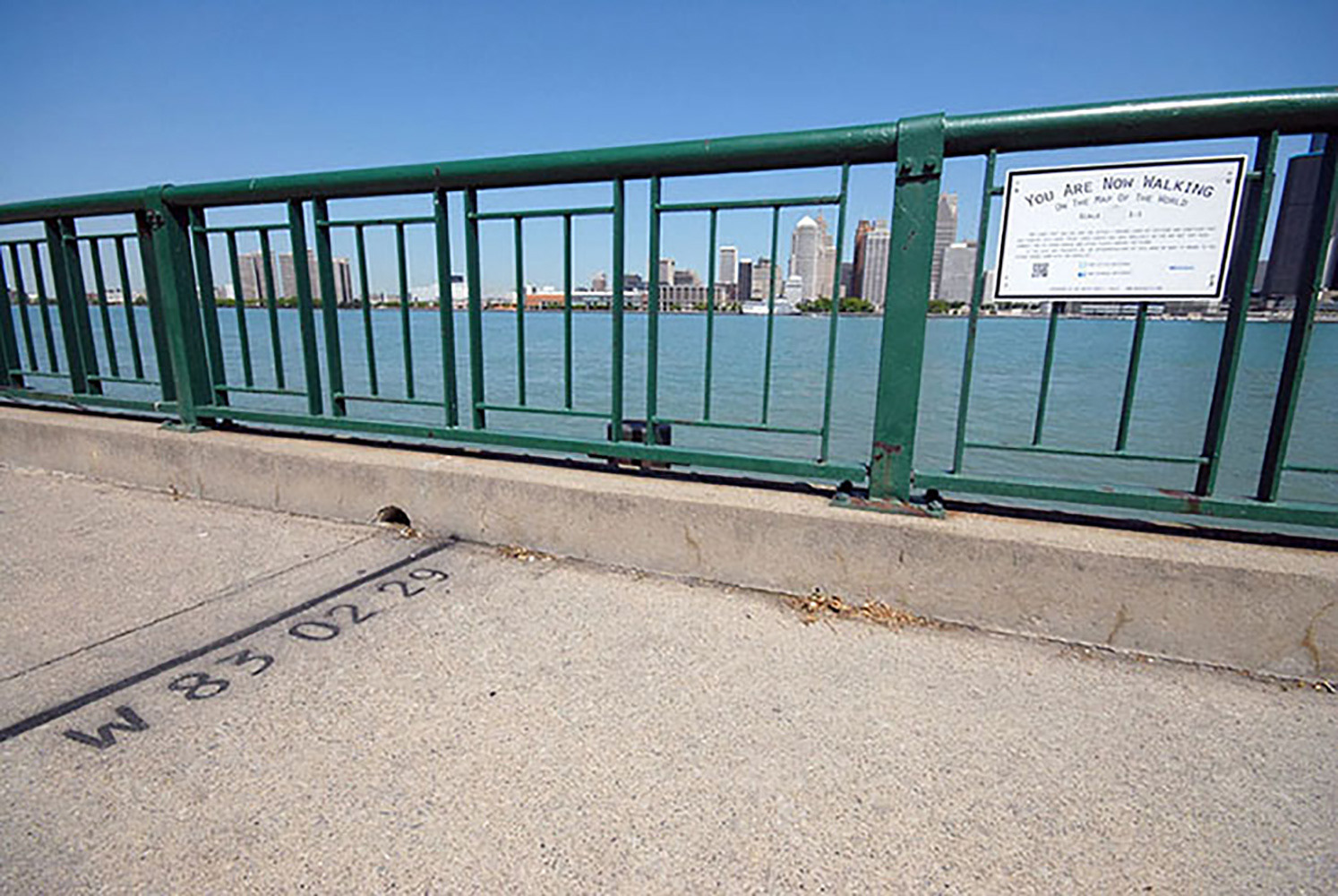 Ross Kelly The 1:1 Map of the World (Installation on the Detroit Riverfront, Windsor, ON), 2012, Signage and Black Chalk