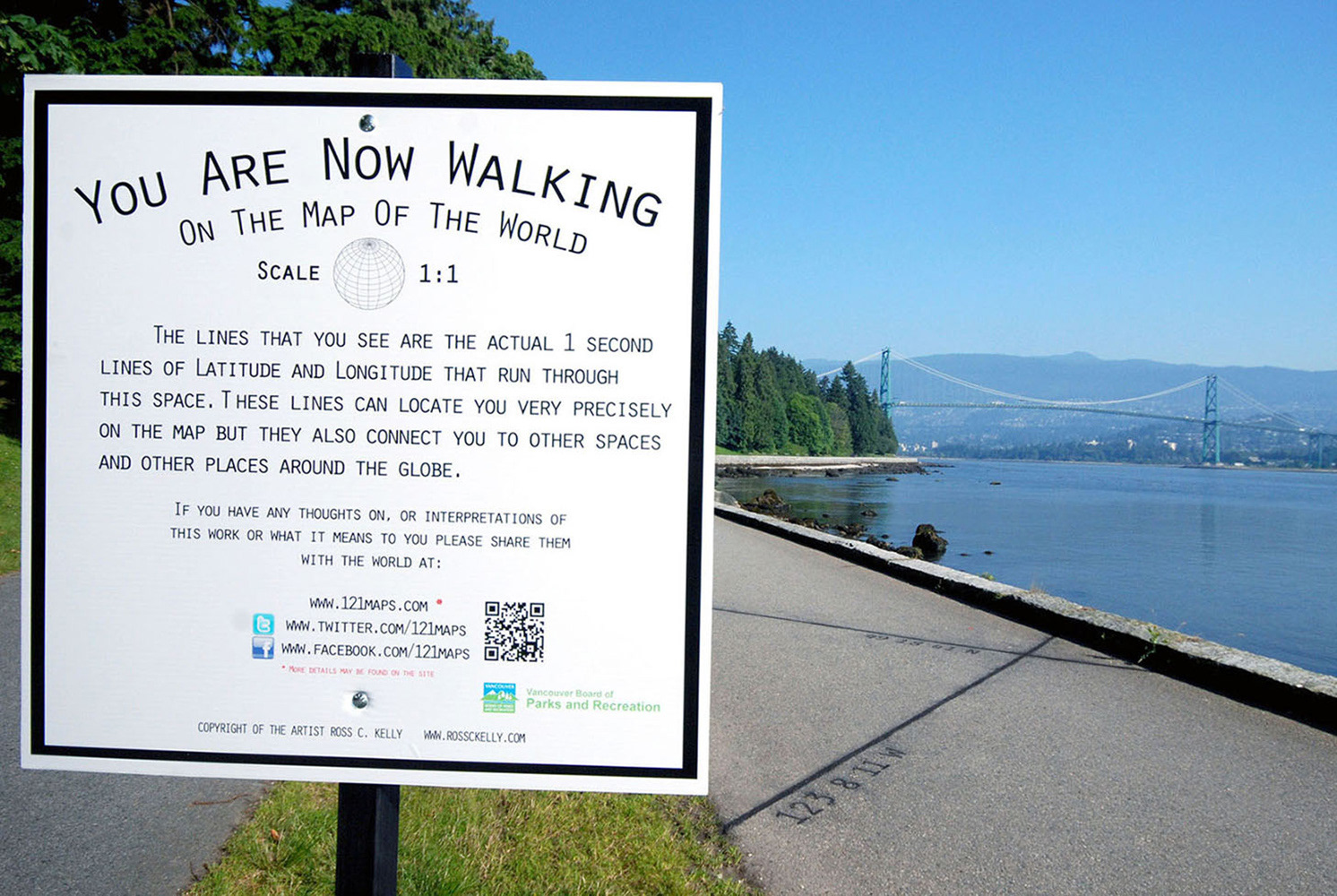 Ross Kelly The 1:1 Map of the World (Installation on the Vancouver Seawall), 2012, Signage and Black Chalk